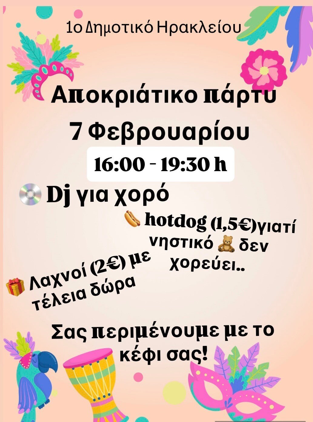 Ο Σύλλογος Γονέων & Κηδεμόνων του 1ου Δημοτικού Ηρακλείου Αττικής, σας προσκαλεί σε ένα αποκριάτικο απόγευμα γεμάτο μουσική και διασκέδαση! 🎉