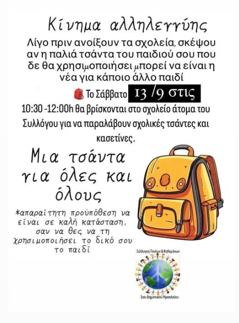 Αν έχουμε τσάντες και γενικά σχολικά είδη από προηγούμενες χρονιές τις δωρίζουμε και κάνουμε και κάποια παιδιά χαρούμενα που ίσως δεν μπόρεσαν να αποκτήσουν μια καινούργια φέτος.